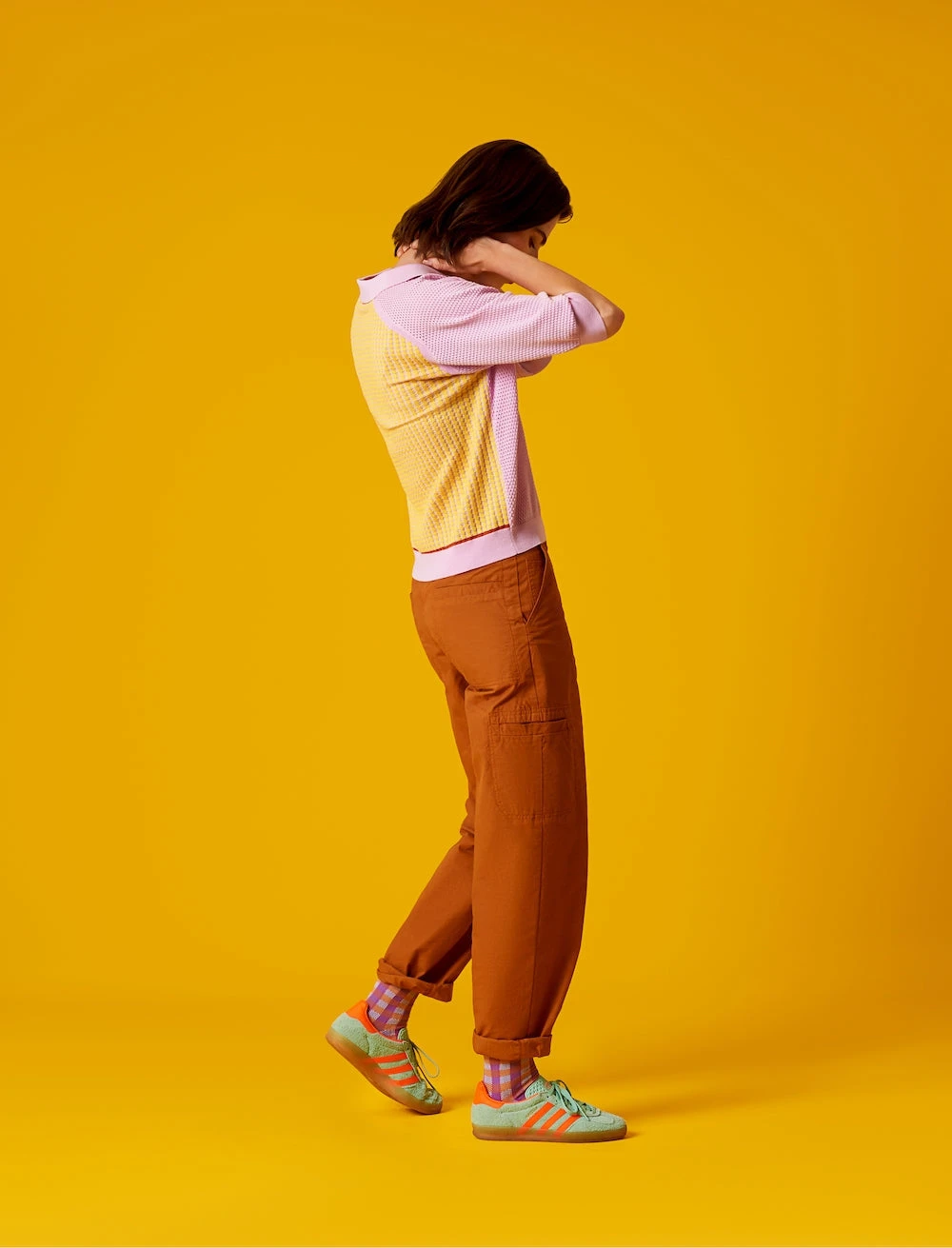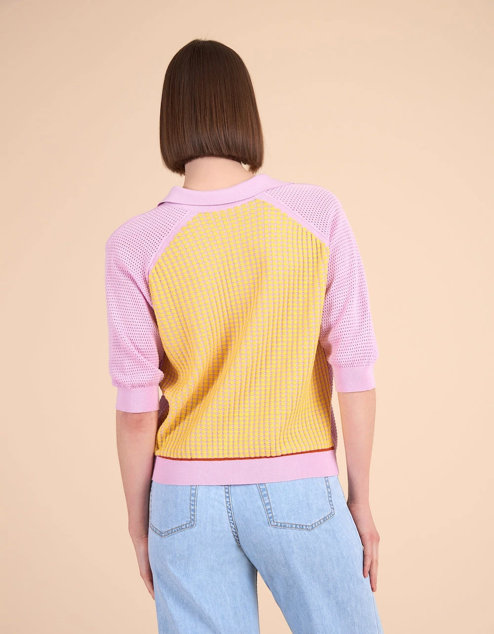 Voor een frisse, moderne lentelook is dit truitje perfect. Deze verfijnd gebreide trui heeft een mesh-achtige look, een andere kleur aan de achterkant en losse polo hals.