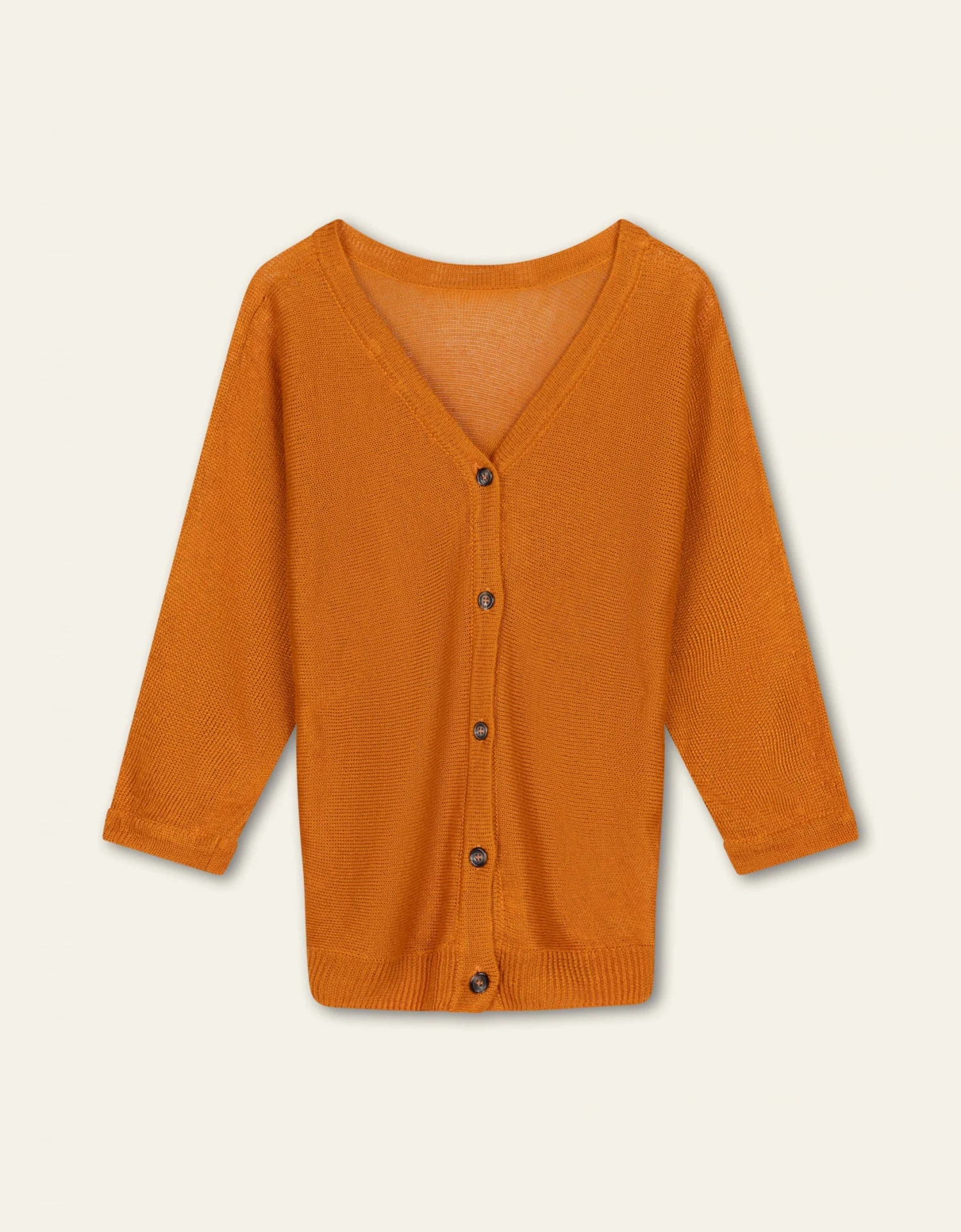 Hele vrouwelijke en elegante trui met driekwart batwing mouwen gebreid met linnen garen. Je kan deze trui met de knoopjes aan de achterkant dragen of als vest met de knoopjes voor.