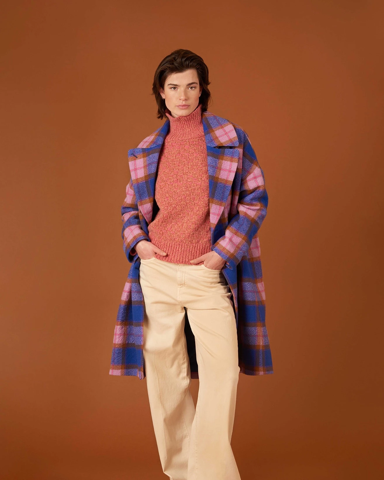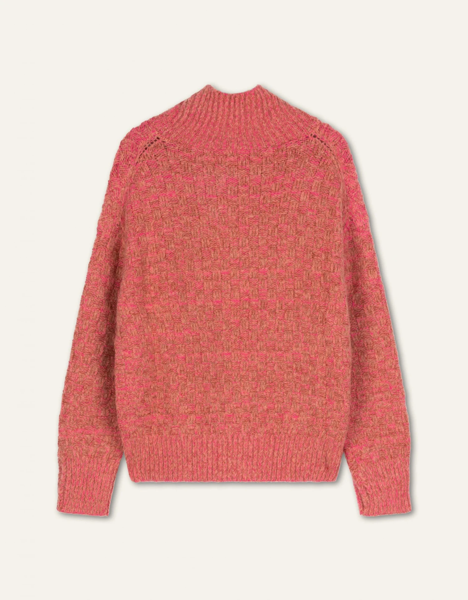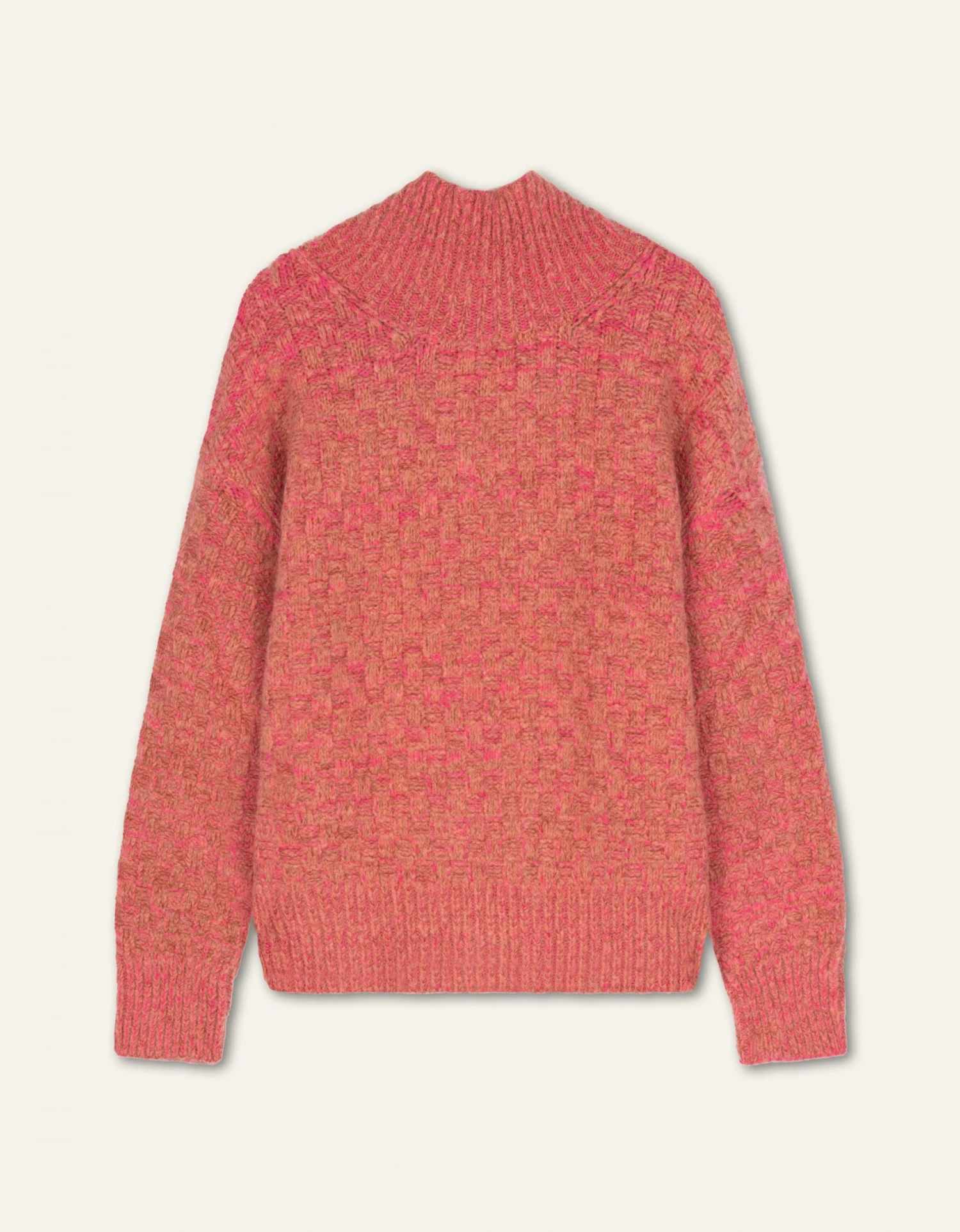 Deze pullover is gebreid met onze eigen tweed garen waarbij zowel glad als brushed wol naar voren komt. Dit geeft een mooi blokjesreliëf, karakteristieke onregelmatigheden en verwarmende zachtheid. Het contrast wordt ook opgezocht door de ruime turtleneck, de manchetten en onderkant net even anders te breien.