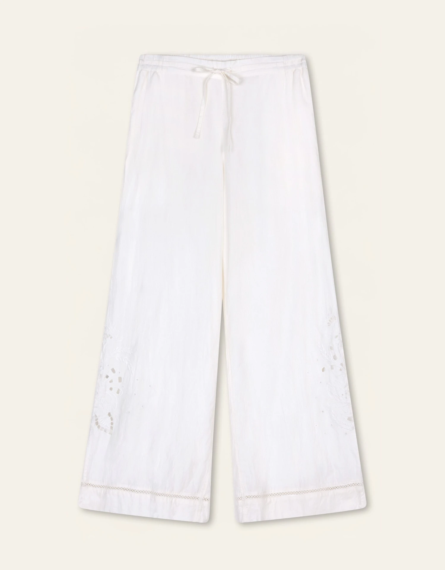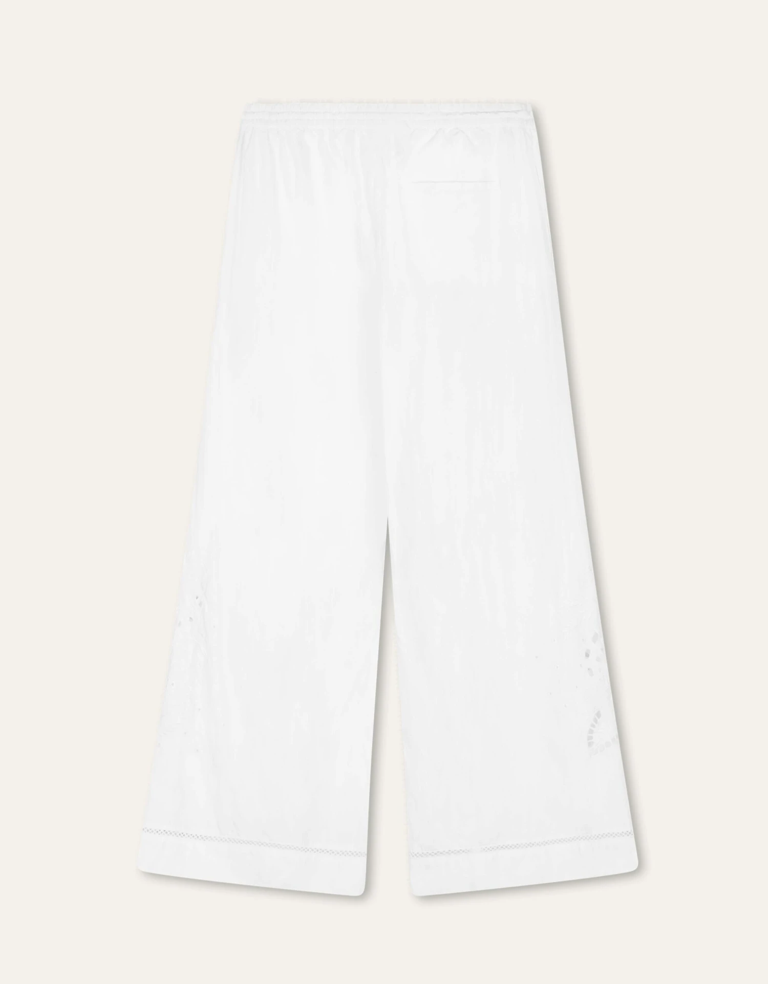 Poplin broek met broderie anglaise detail bij de onderkant van de lange en wijdvallende pijpen. Het artwork verschilt per pijp op subtiele wijze.