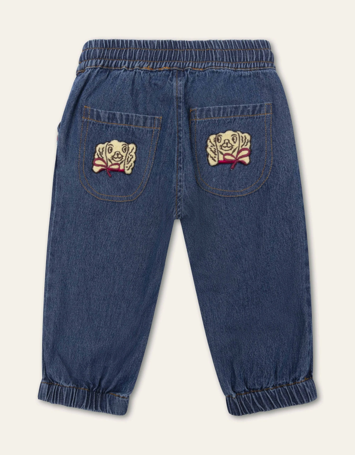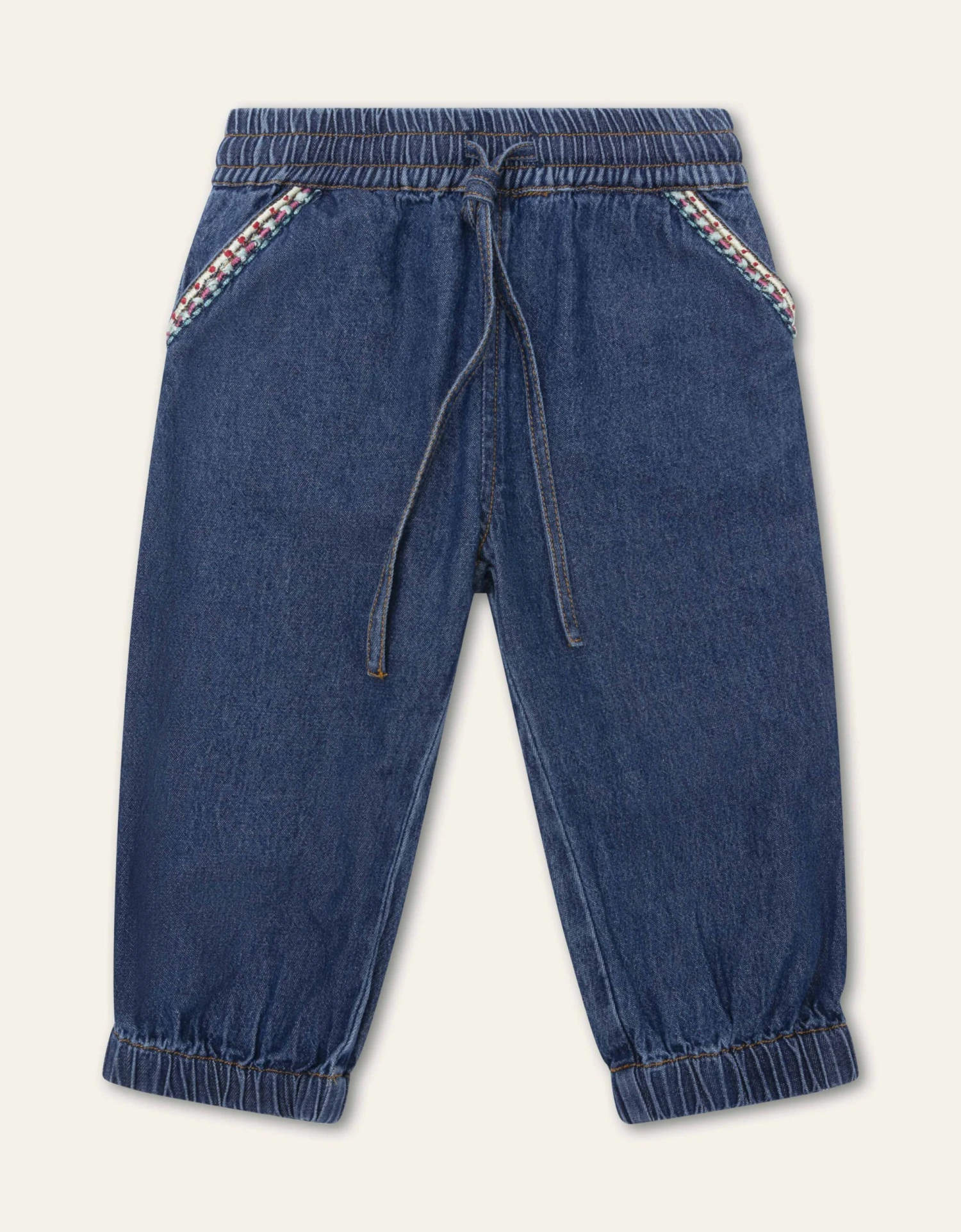 Comfortabele denim broek van katoen met matching drawstring. De onderkant van de pijpen hebben prettige stretch en de zakken zijn afgewerkt met een speelse bies.