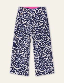 Dessin Katia is onze Ikat bloem in het herkenbare diepe blauw. Het staat speels op deze velours broek. De broek sluit met knoopjes voor en heeft een elastiek in de taille.