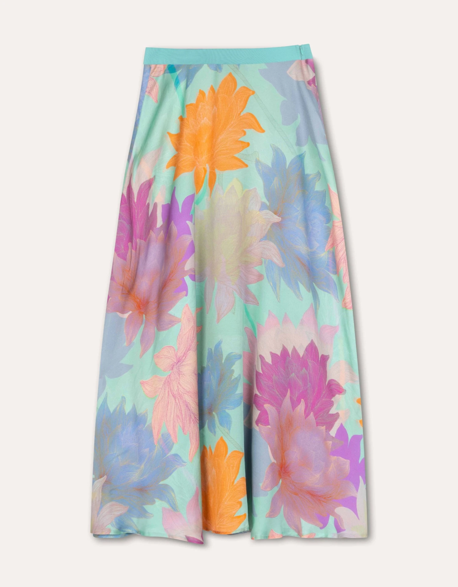 Met hele fijne lijntjes zijn deze ets-achtige grote pioenen getekend voor het dessin Peonie Flowers. Weelderig shinend op deze fit en flare rok die sluit met een blinde rits in zij. Door de platte tailleband valt de rok mooi uit.