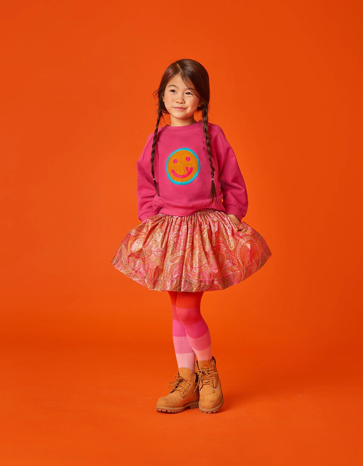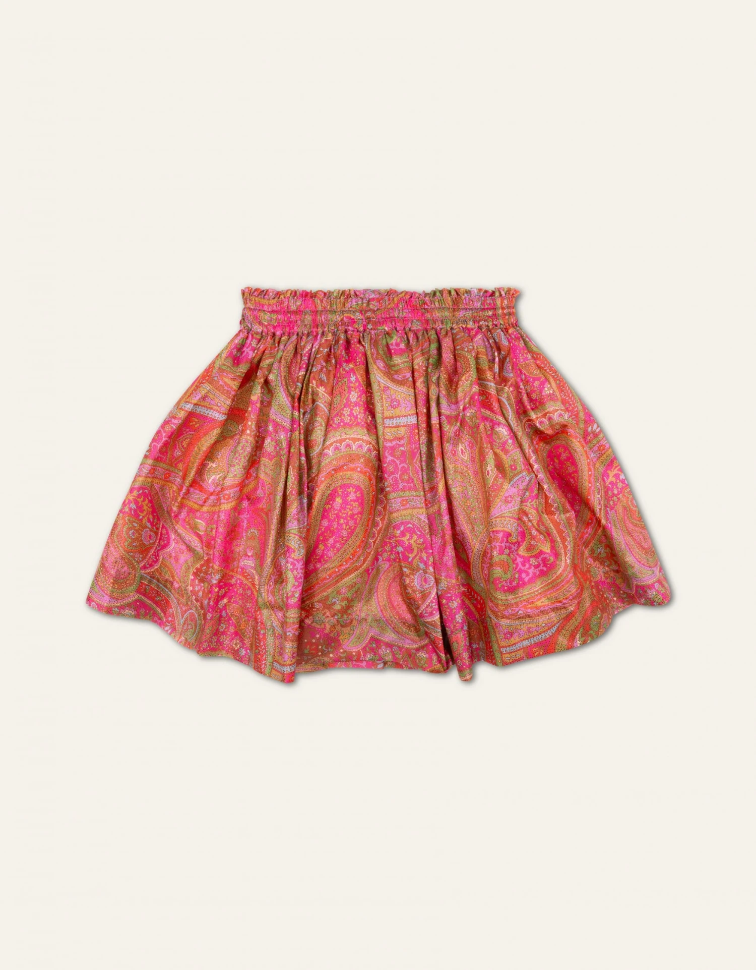 Een echte feestnummer is dit rokje met roze glitters, roze metallic glans, prachtige Paisley en knalroze voering. De elastische taille kan je extra aansnoeren met de vrolijke drawstring.