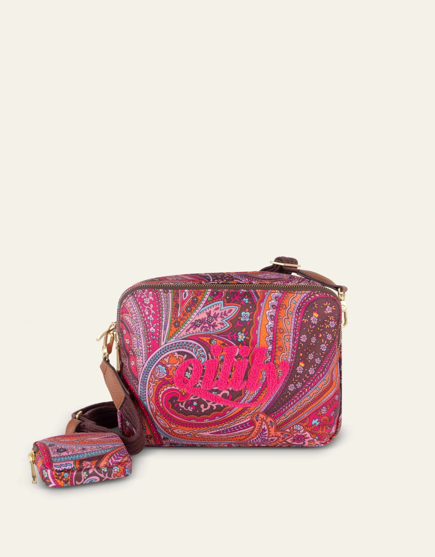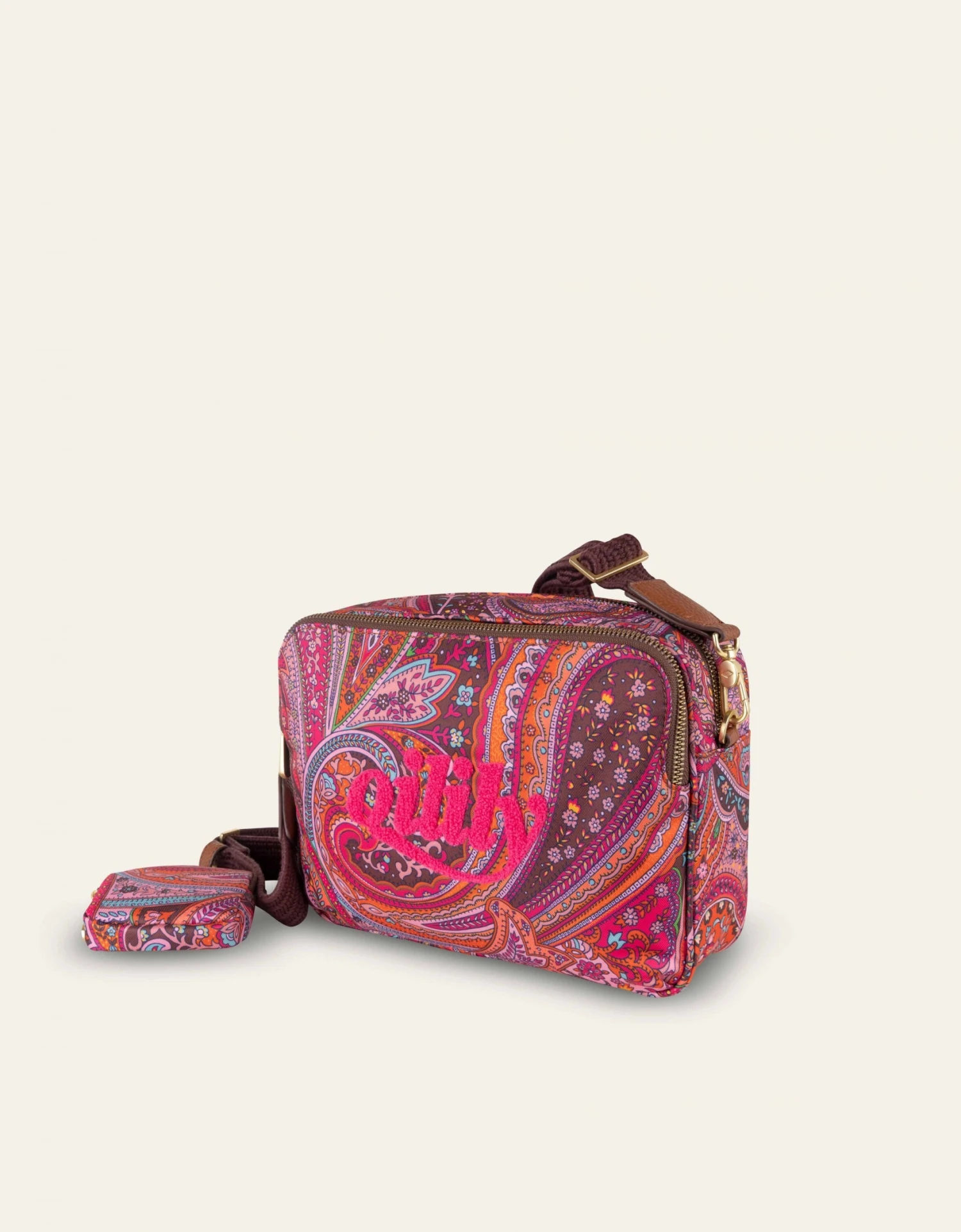 Een mini-schoudertas met een iconische Oilily Paisley-print. Inclusief een Airpod-hoesje dat aan de schouderband bevestigd kan worden, eveneens in de prachtige Decadent Chocolate Paisley-print.