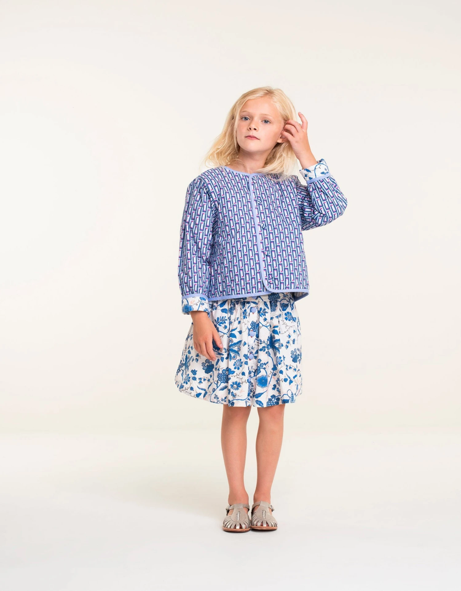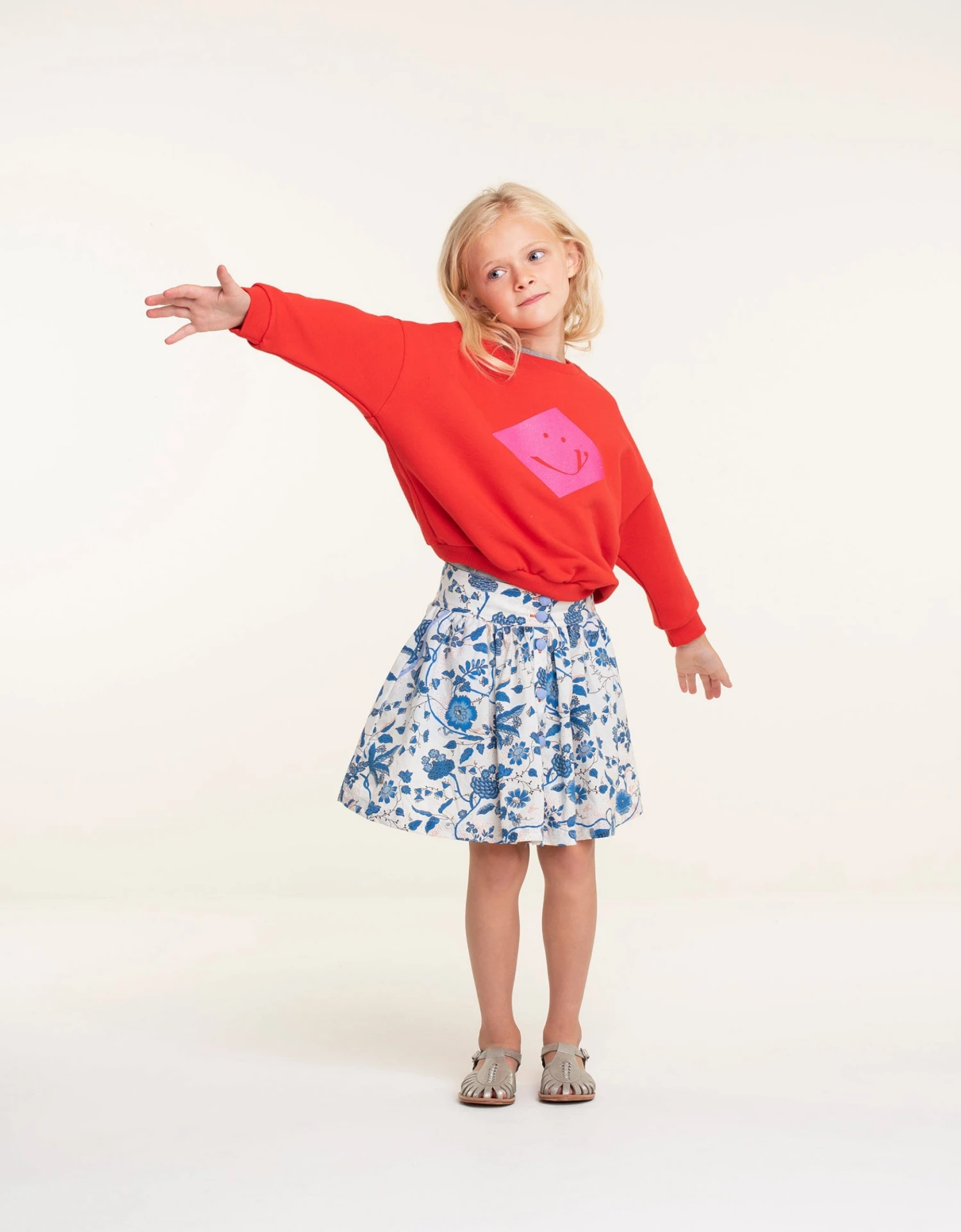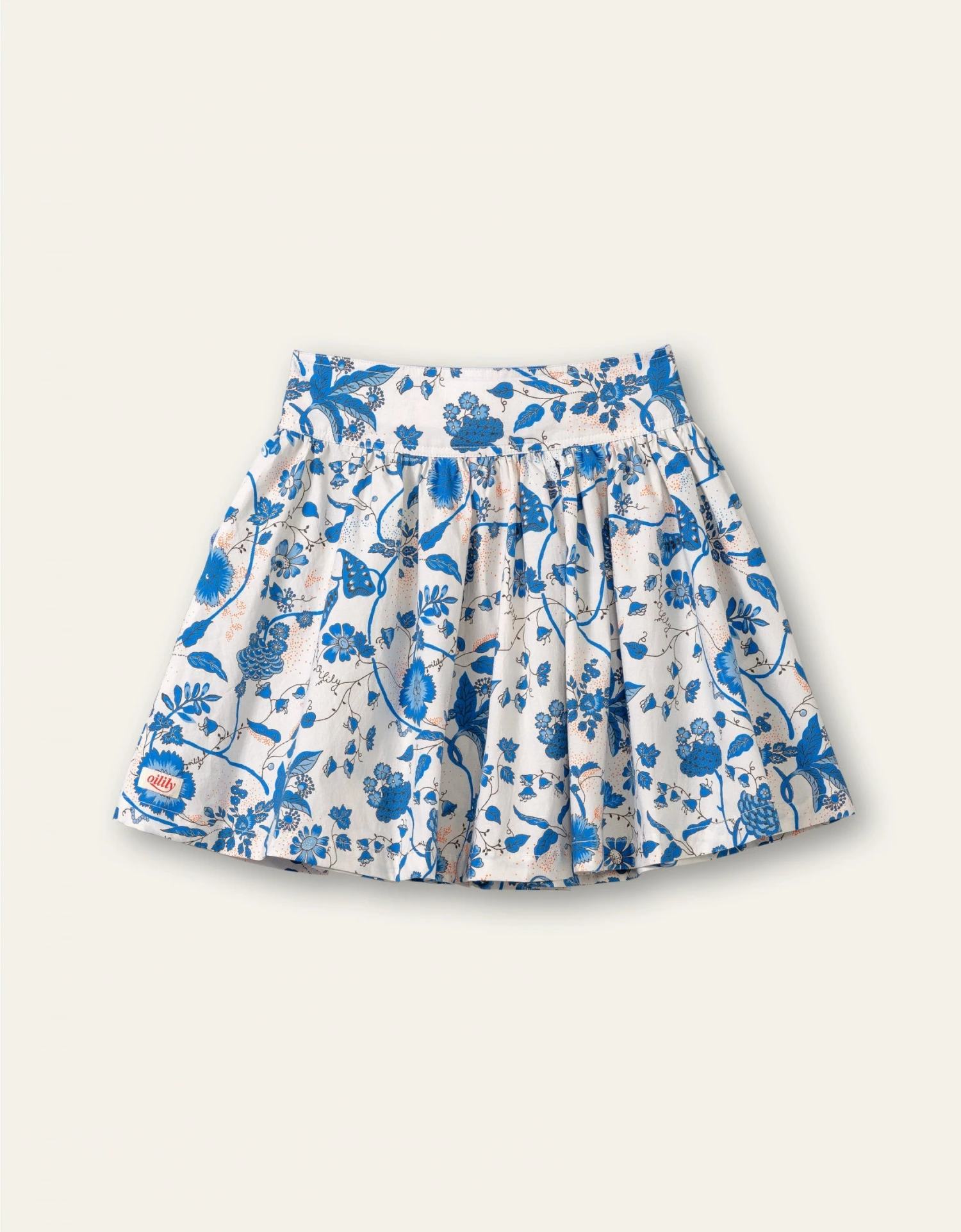 Wijd uitlopend rokje met onze mooie Bella bloemen. Het blauw en oranje komen mooi naar voren door de screenprint-techniek. Het rokje heeft knoopjes aan de voorkant en is verstelbaar aan de binnenkant. En ’tuurlijk heeft de rok zakjes in de zij. – Regular fit – 100% katoen