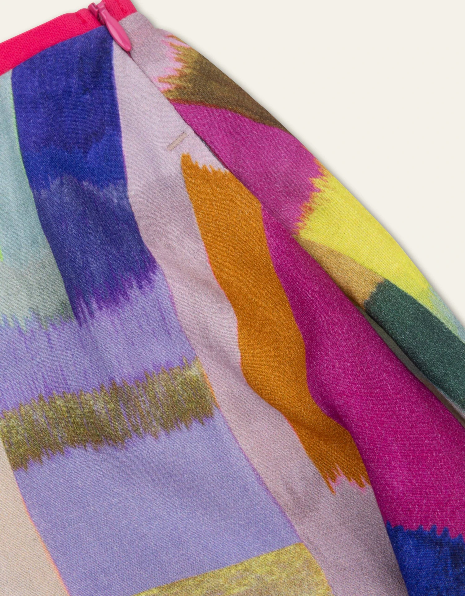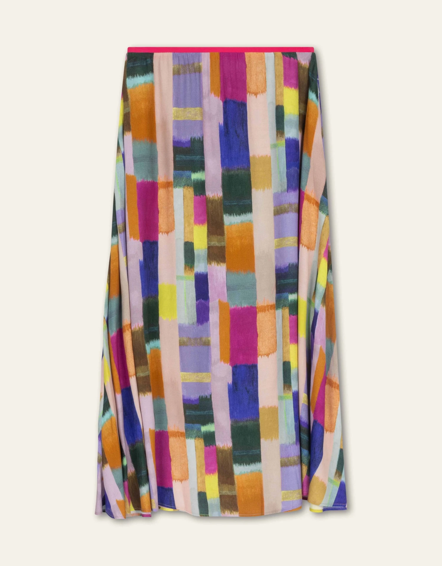 Het Taki dessin straalt spectaculair op deze midi cirkelrok. De handgetekende kleurvlakken lijken door de flair nog meer in elkaar over te vloeien. Deze rok heeft een blinde rits en zakken in de zij.