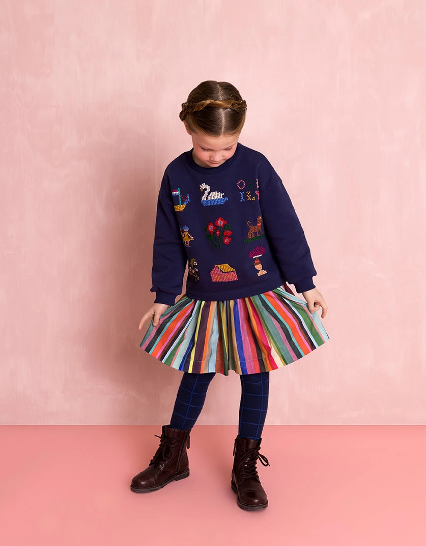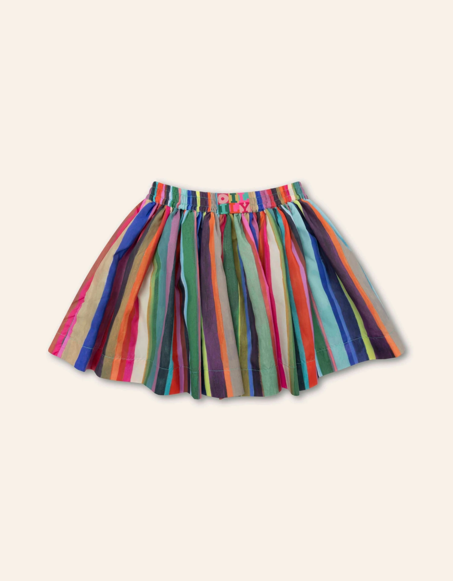 De print Pieternella is geïnspireerd door de tulpenvelden gezien van bovenaf. Het maakt deze vrolijke strepen nog leuker en het staat speels op dit leuke rokje met matching drawstring.