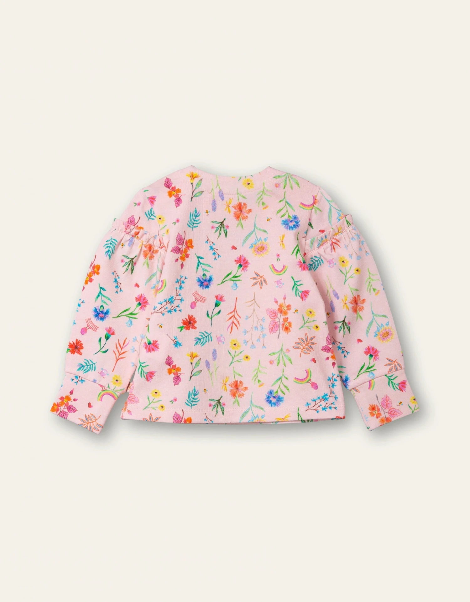 Hoe lief is dit!? Een zacht roze lange mouwen shirt met handgetekende bloemetjes en beestjes voor de allerkleinsten! Het schattige roesrandje op de mouwtjes maakt dit shirtje helemaal af. Bij de hals zitten links en rechts drukknopen en de mouwtjes hebben boordje die omgeslagen kan worden. – Gemaakt van superzachte katoen – GOTS-gecertificeerd* *GOTS-gecertificeerd: Wereldwijd toonaangevende textielverwerkingsstandaard voor biologische vezels.