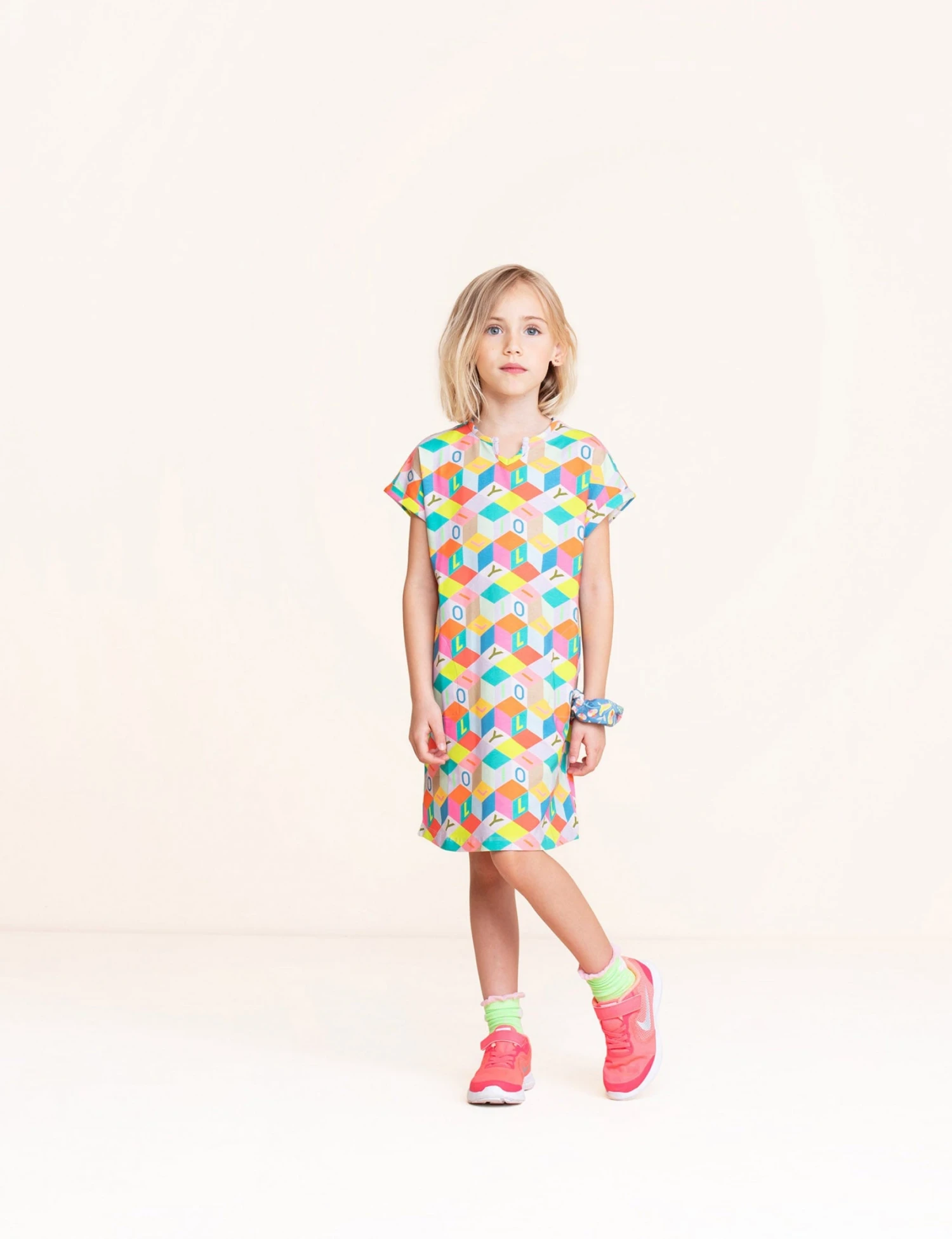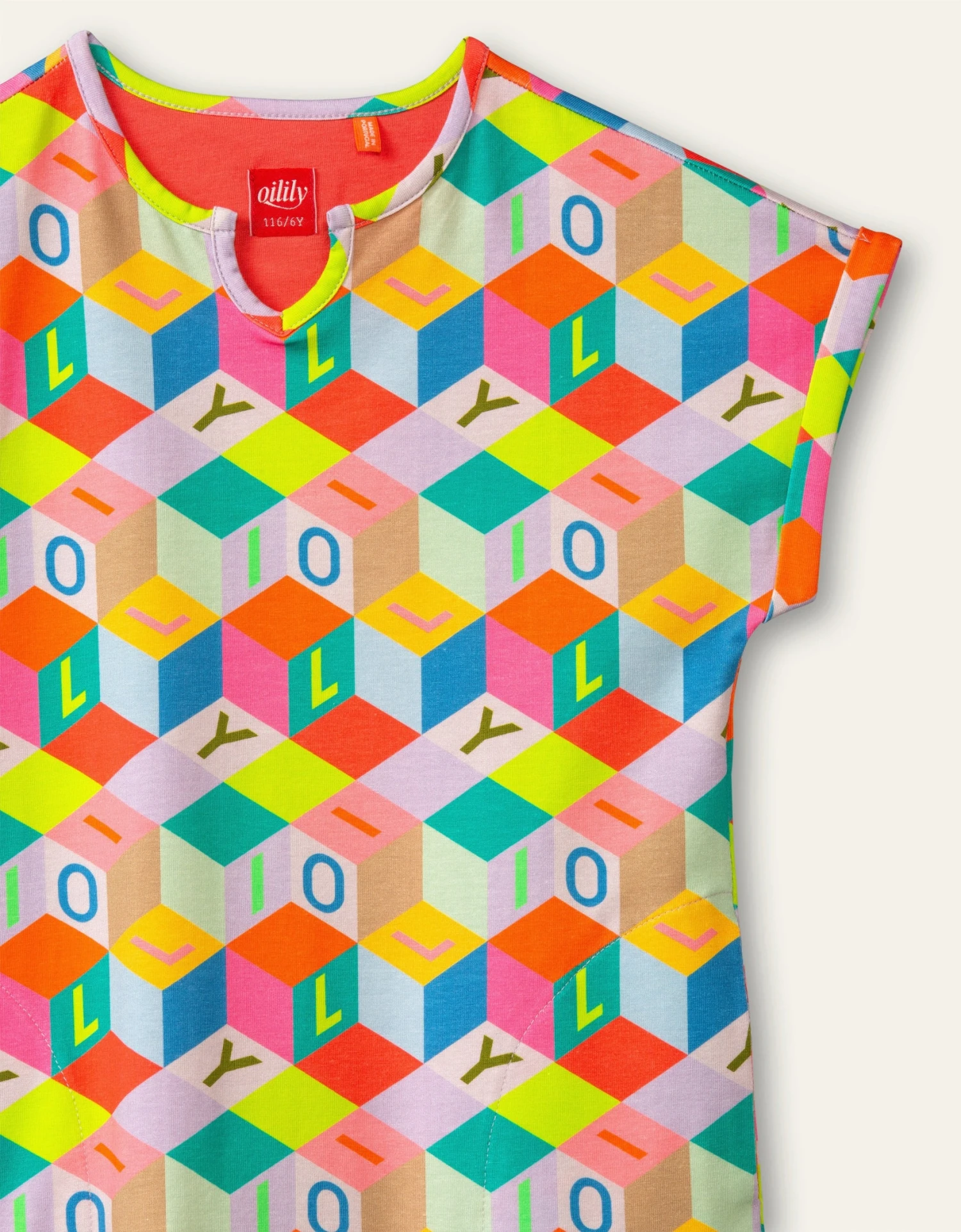 Ken je dat spelletje tijdens lange autoritten waarbij je alle rode auto’s moet tellen? Waarom tel je nu niet alle oranje blokken op je jurk? Of alle letters O of L? Je verveelt je nooit meer met deze bio-katoenen jurk met korte mouwen.