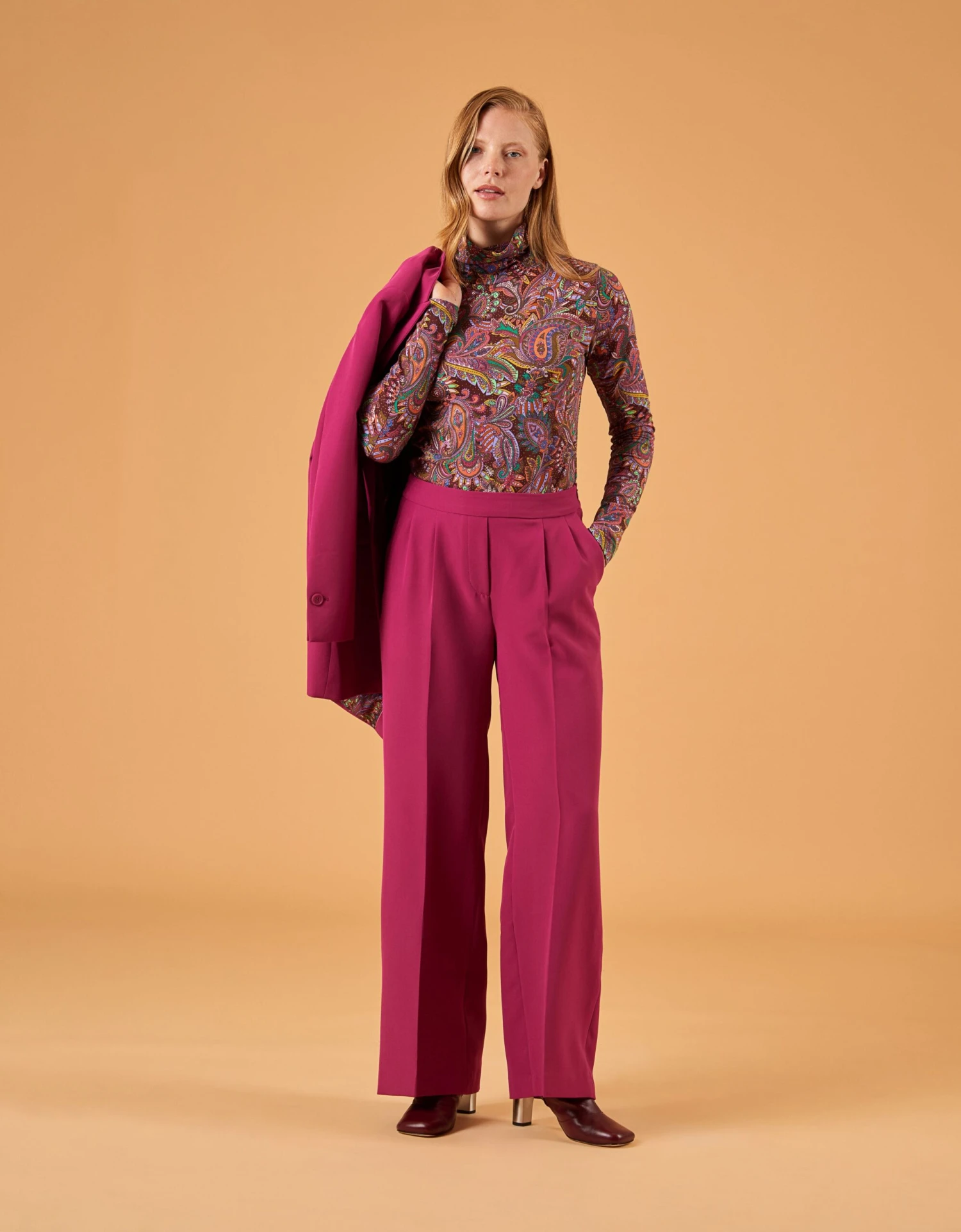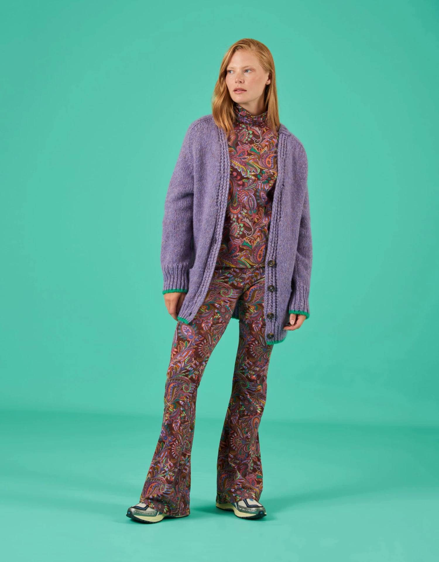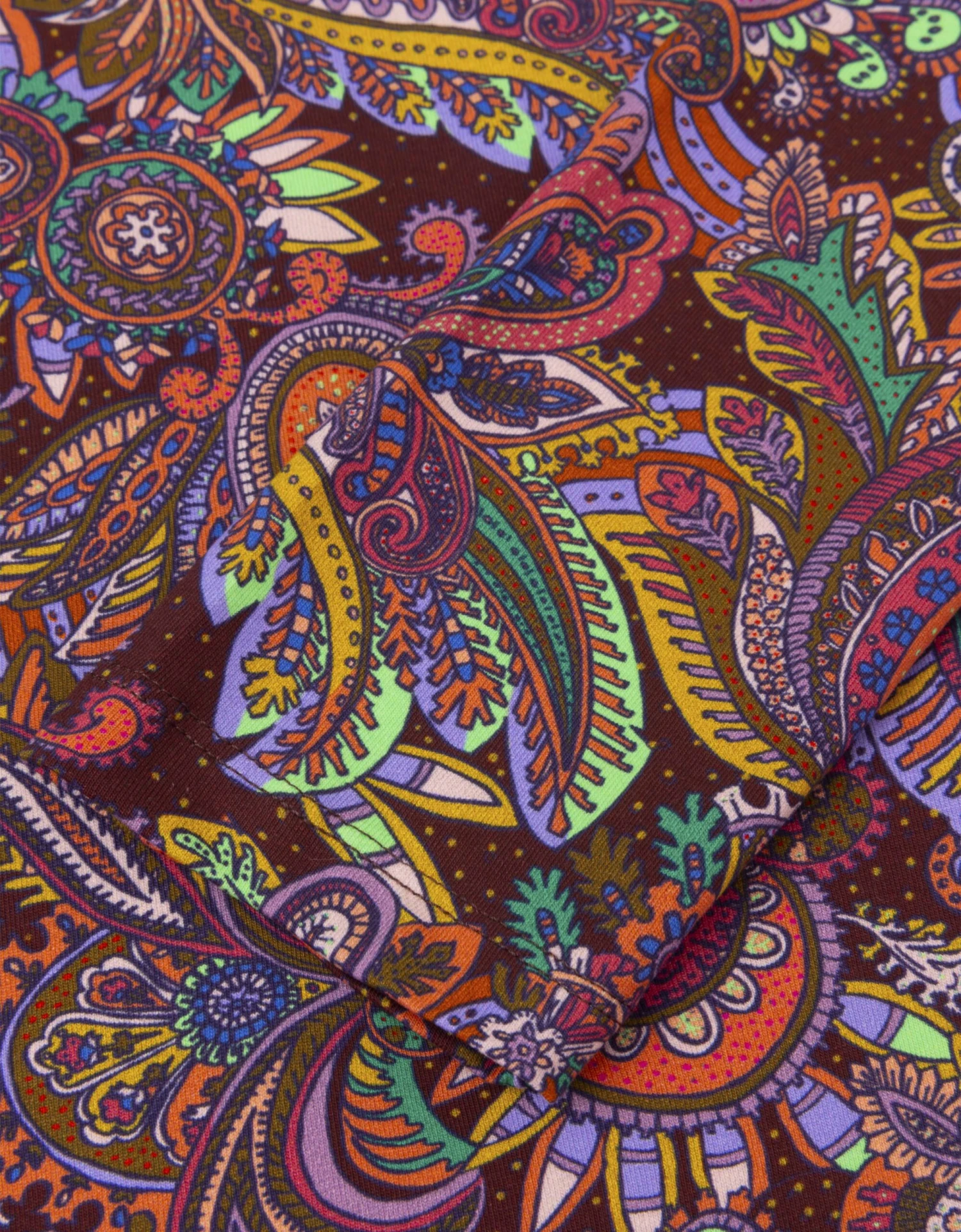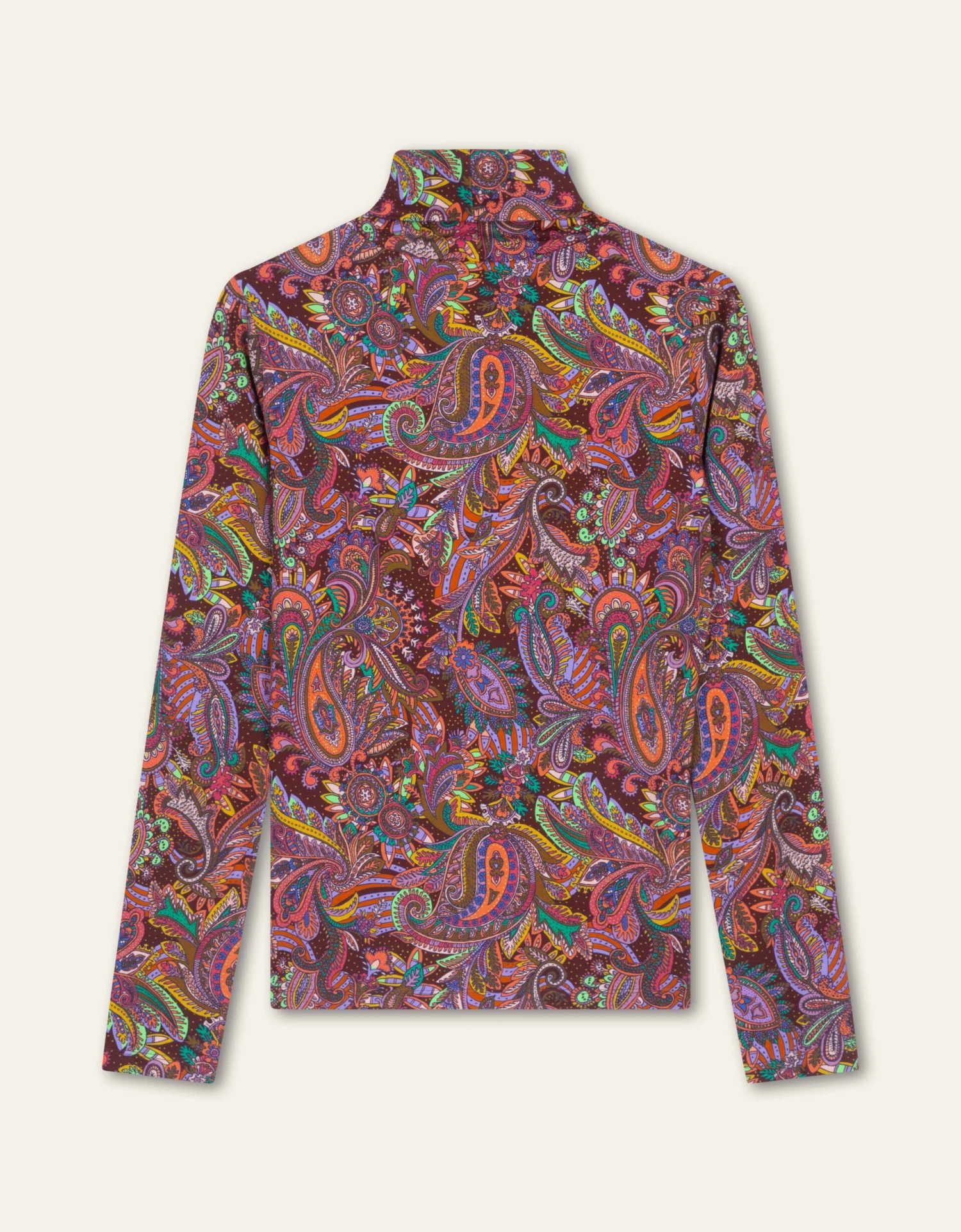 Dessin Everly Paisley is digitaal getekend in felle kleuren dat een mooi contrast vormt op de chocoladebruine basis. Draag deze top als prettig laagje onder een jasje of vest, of juist als eye catching bovenlaag. Deze heerlijke, slim fitting trui met col is de ideale layering piece.