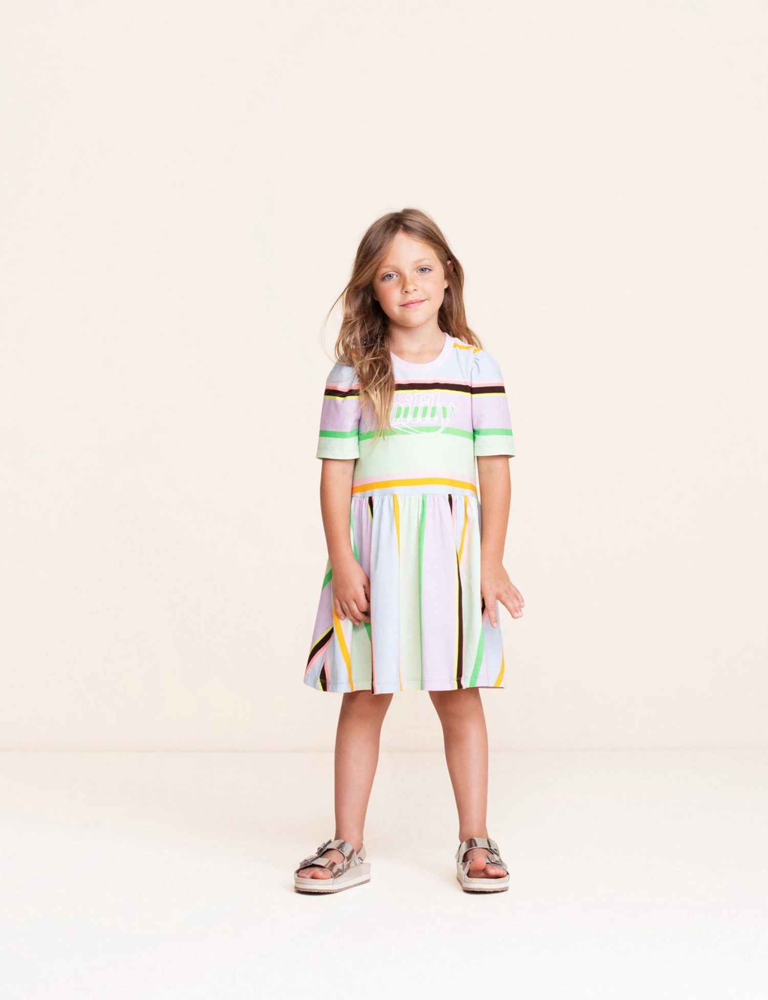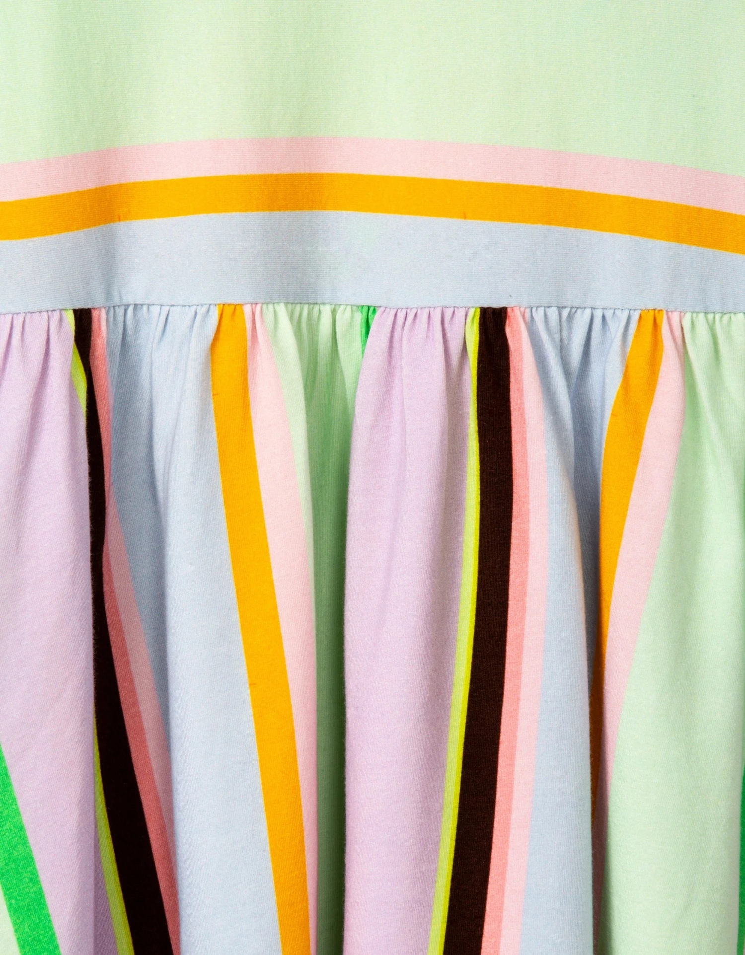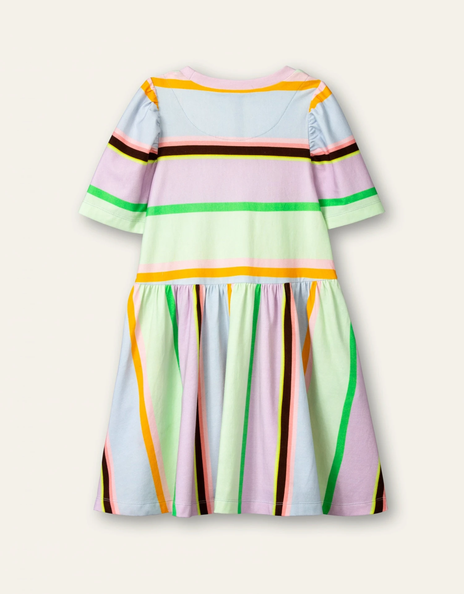 Het leven is niet rechtlijnig, maar we zijn wel gek op rechte streepjes op jurkjes zo nu en dan. Vooral als deze heerlijke, vrolijke kleuren heeft. Gemaakt van zacht katoen met kleine plooitjes zodat de rok heerlijk zwiert, steekzakjes en een subtiel pofmouwtje. Easy wear om nooit meer uit te trekken.
