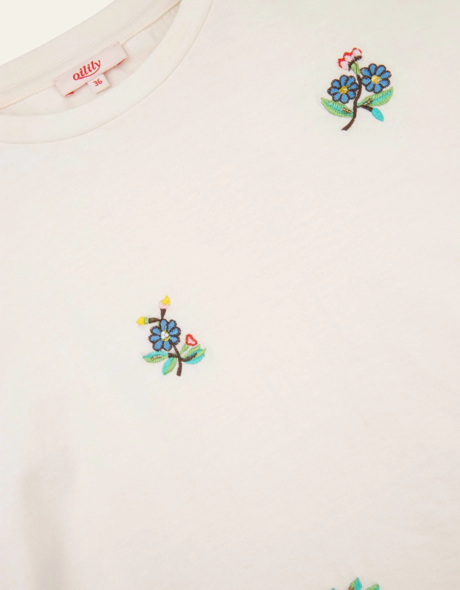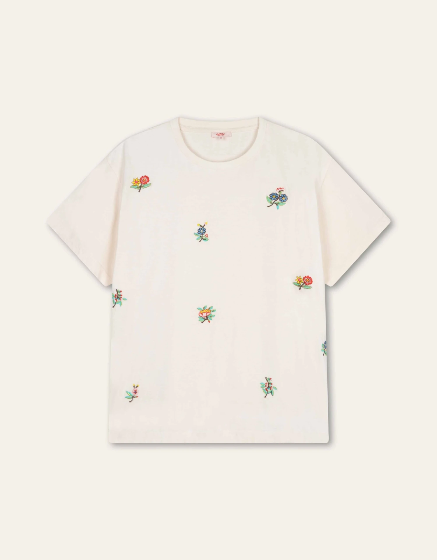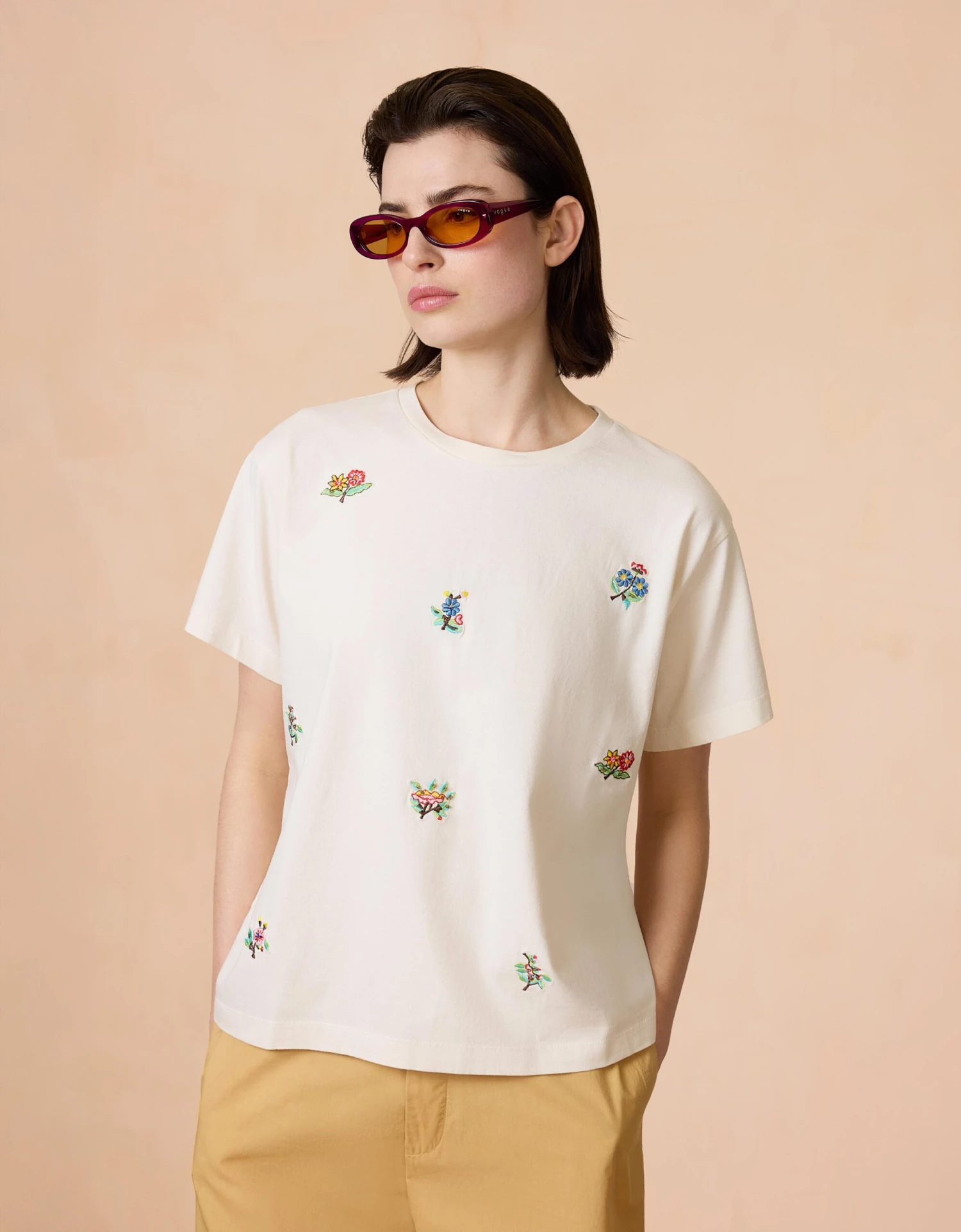 De boxy fit van dit T-shirt vormt een mooi canvas voor de bijzondere geborduurde details van pailletten en kralen. Een shirt om constant iets moois op te ontdekken tijdens zachte lentedagen.