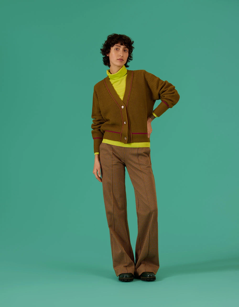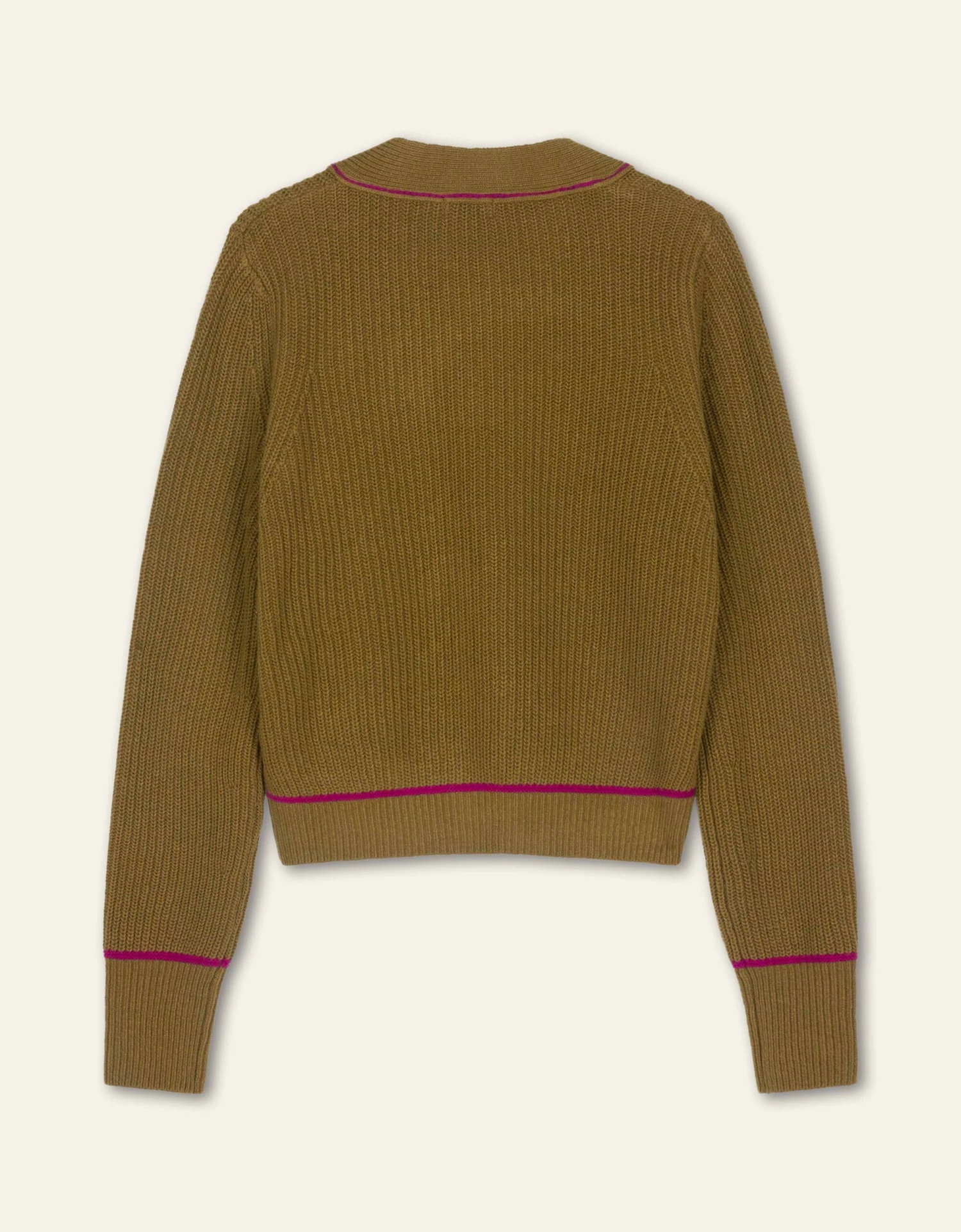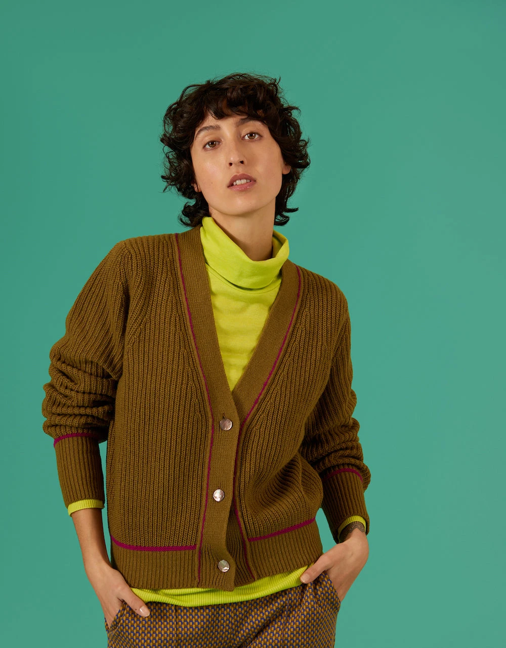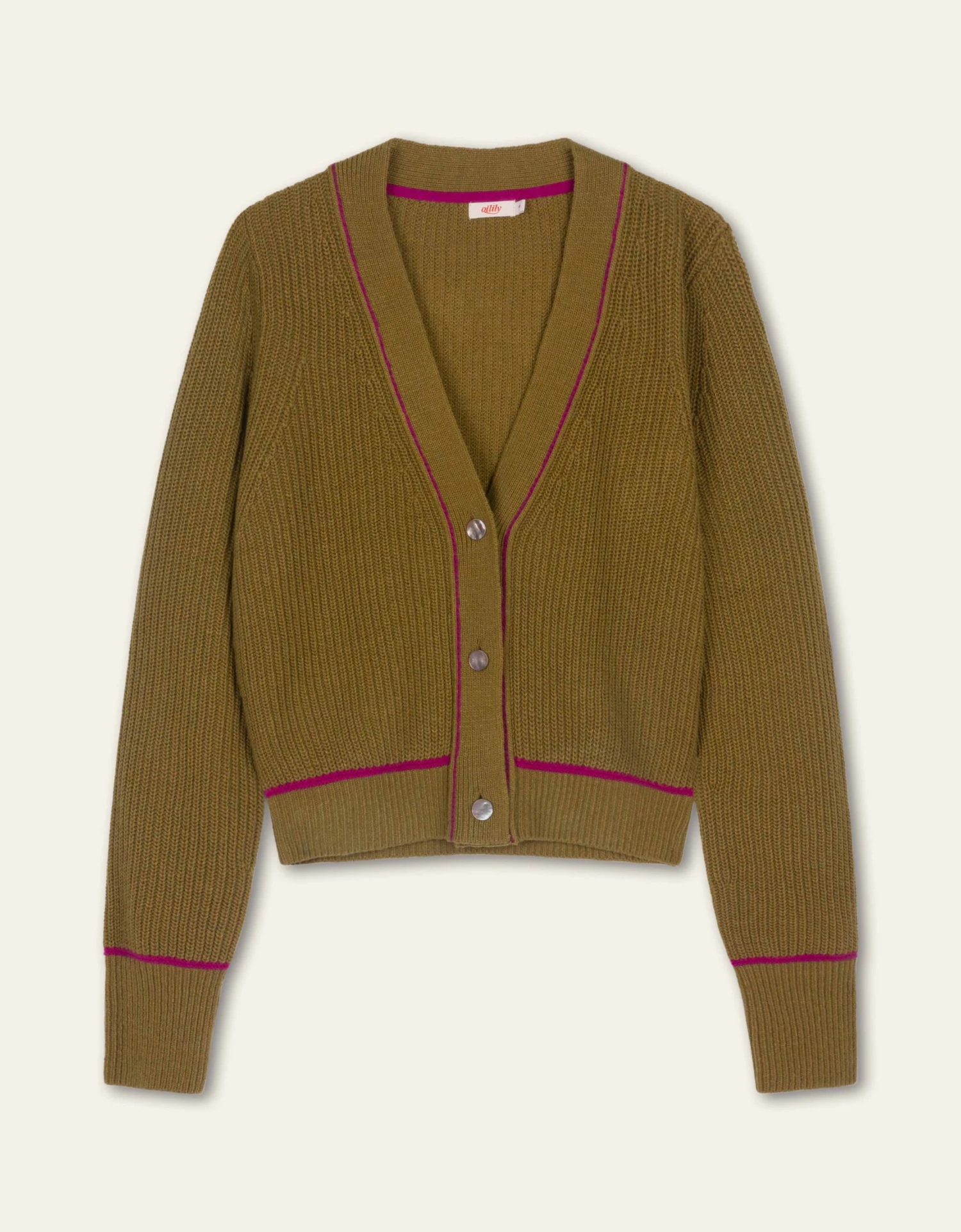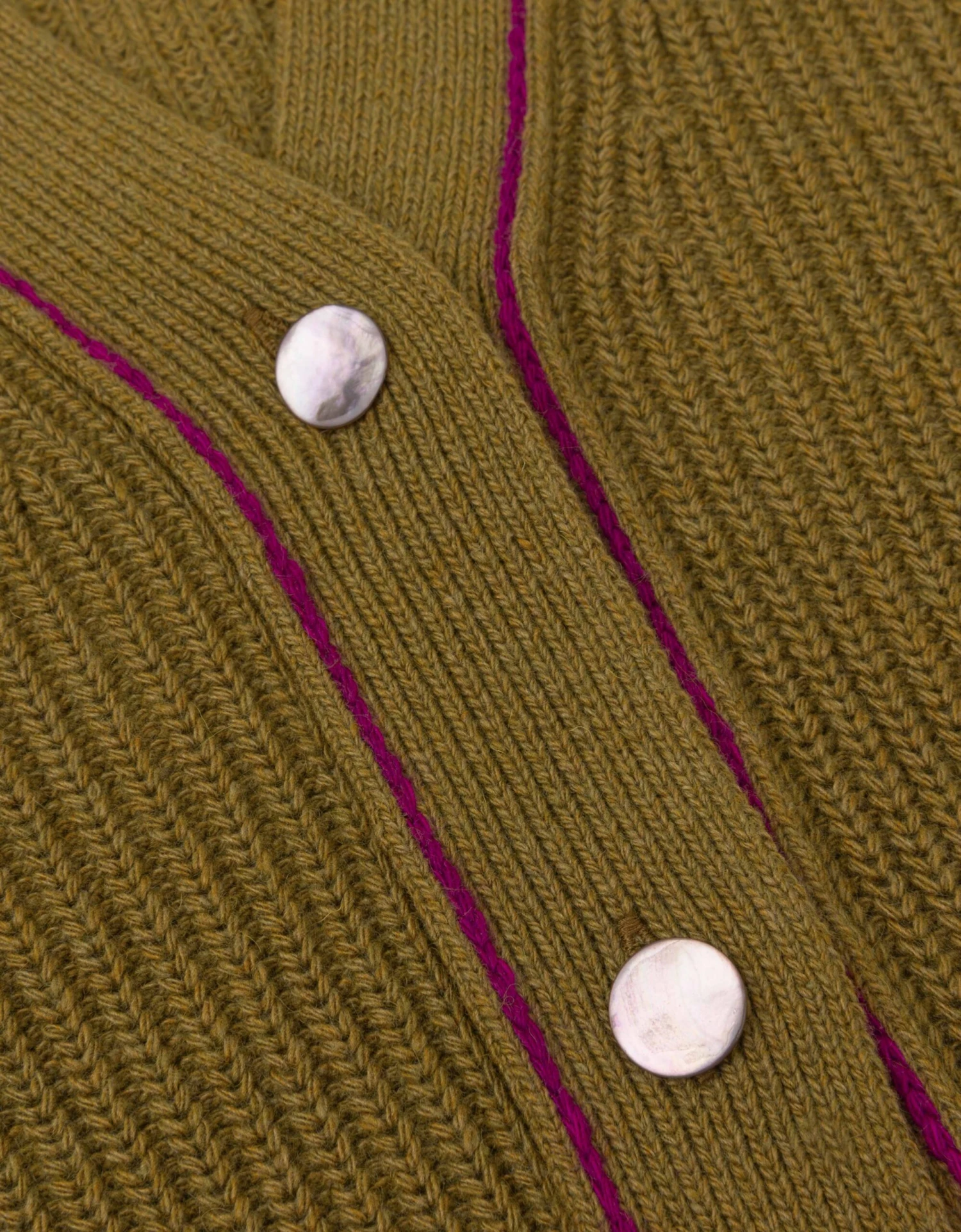 Stoer vest met cardigan steken en een Italiaans garen contrast voor extra diepte in kleur. De hoge manchetten en de glanzende knoopjes zijn elegant wat mooi past bij het grove breisel. Om het model van je wollen items goed te houden, raden we aan dit kledingstuk altijd opgevouwen in je kast te leggen.