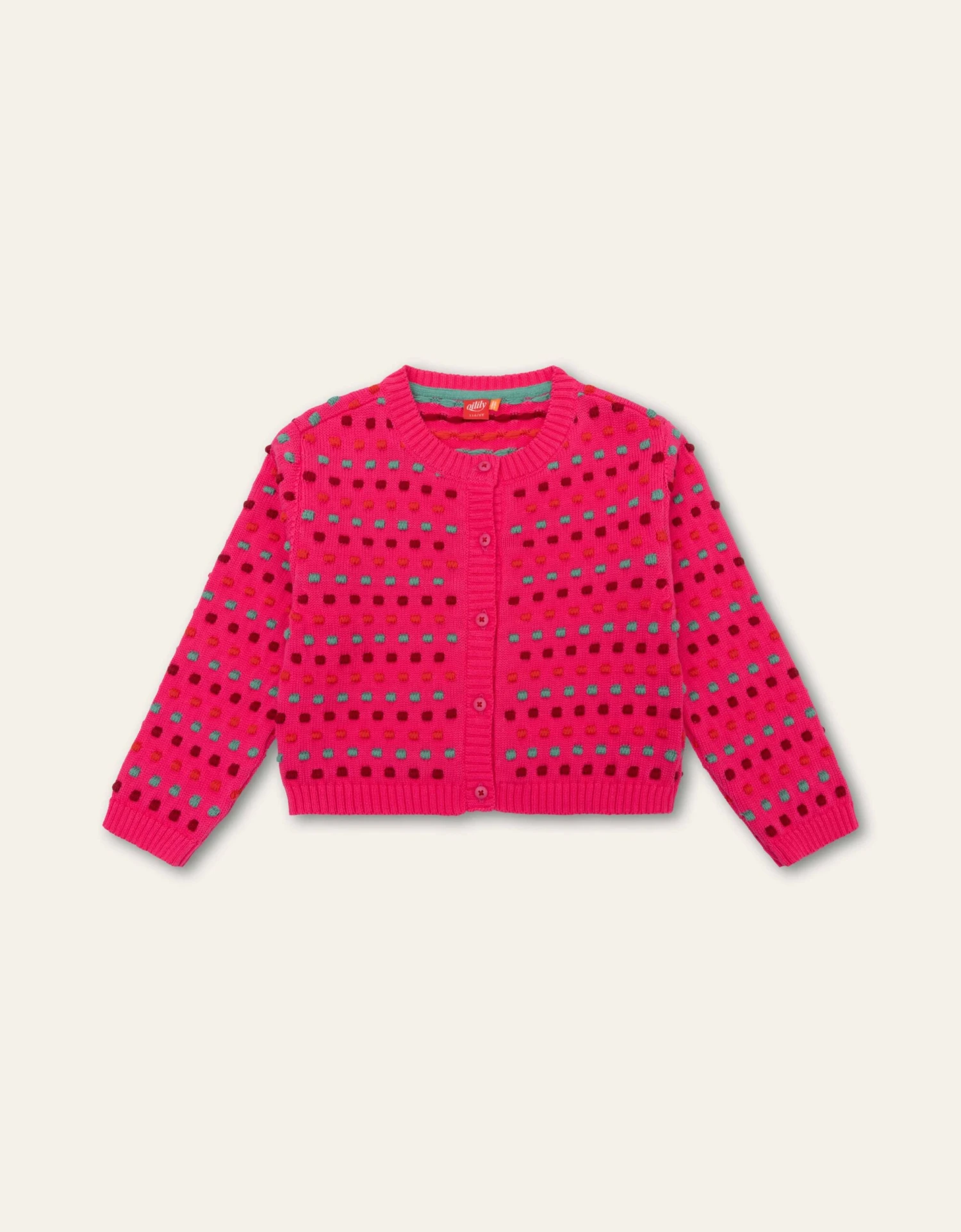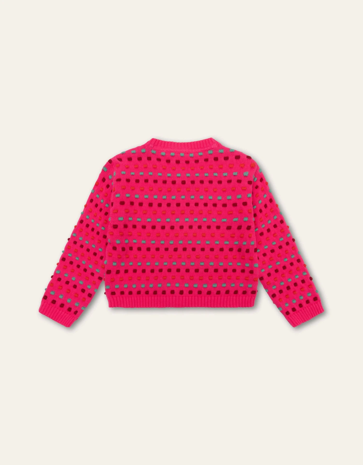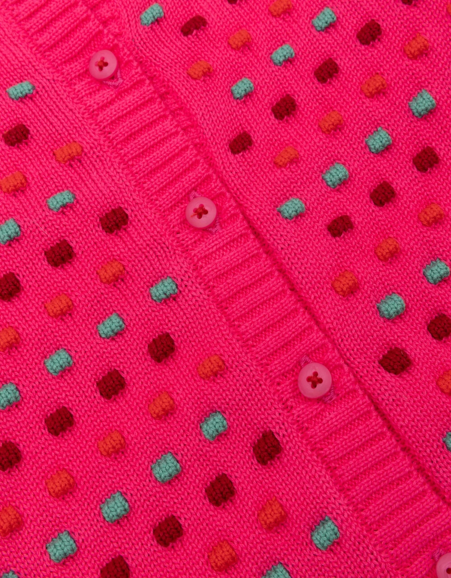 Trek een vrolijke vest aan en je maakt elke outfit helemaal af. Vooral met deze kleur bright rose en het gezellige patroon van stippen en matching knopen.