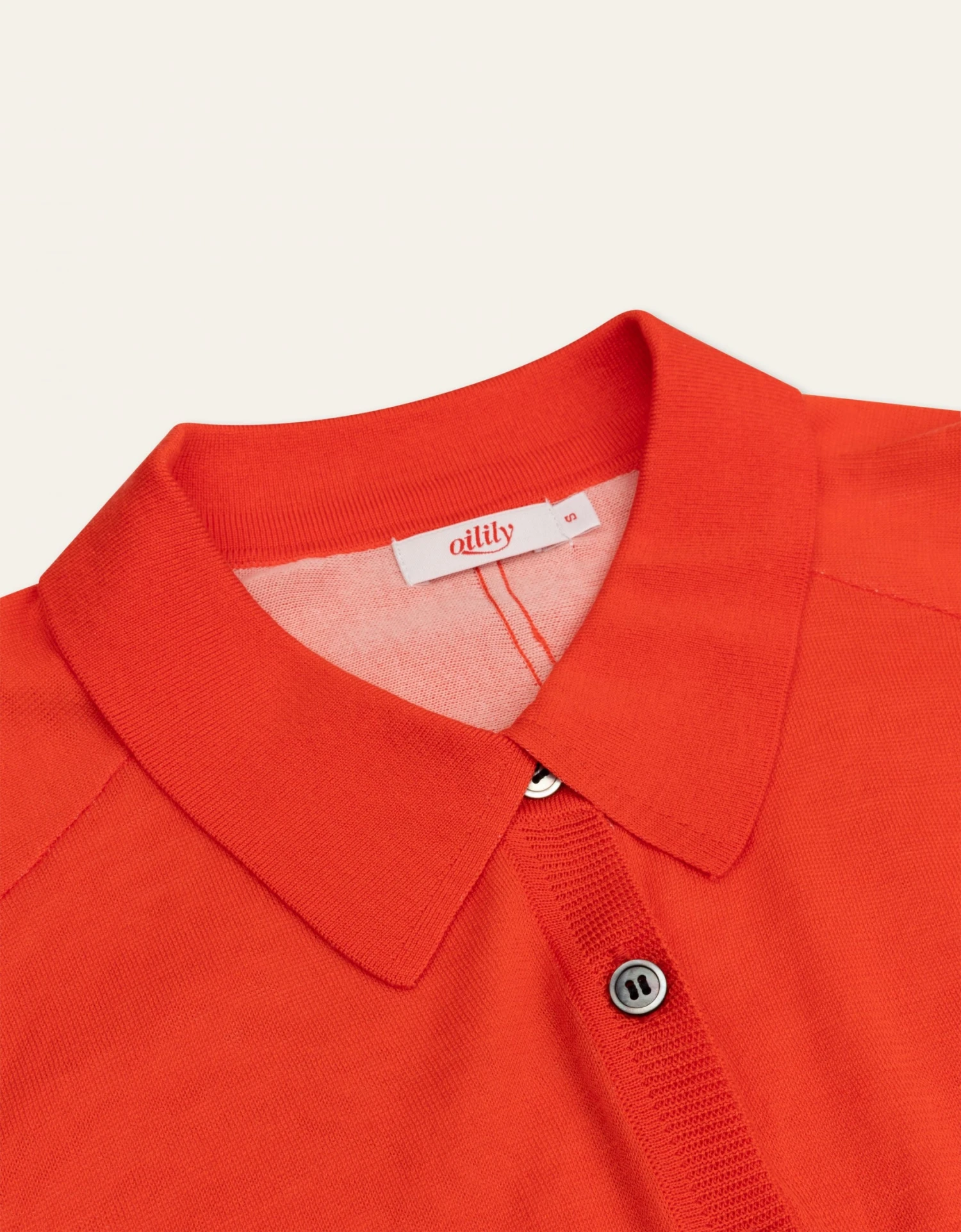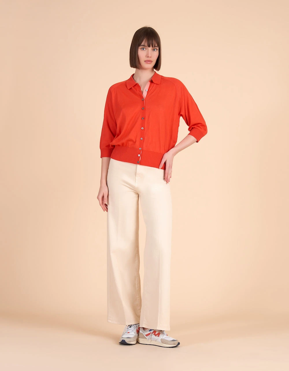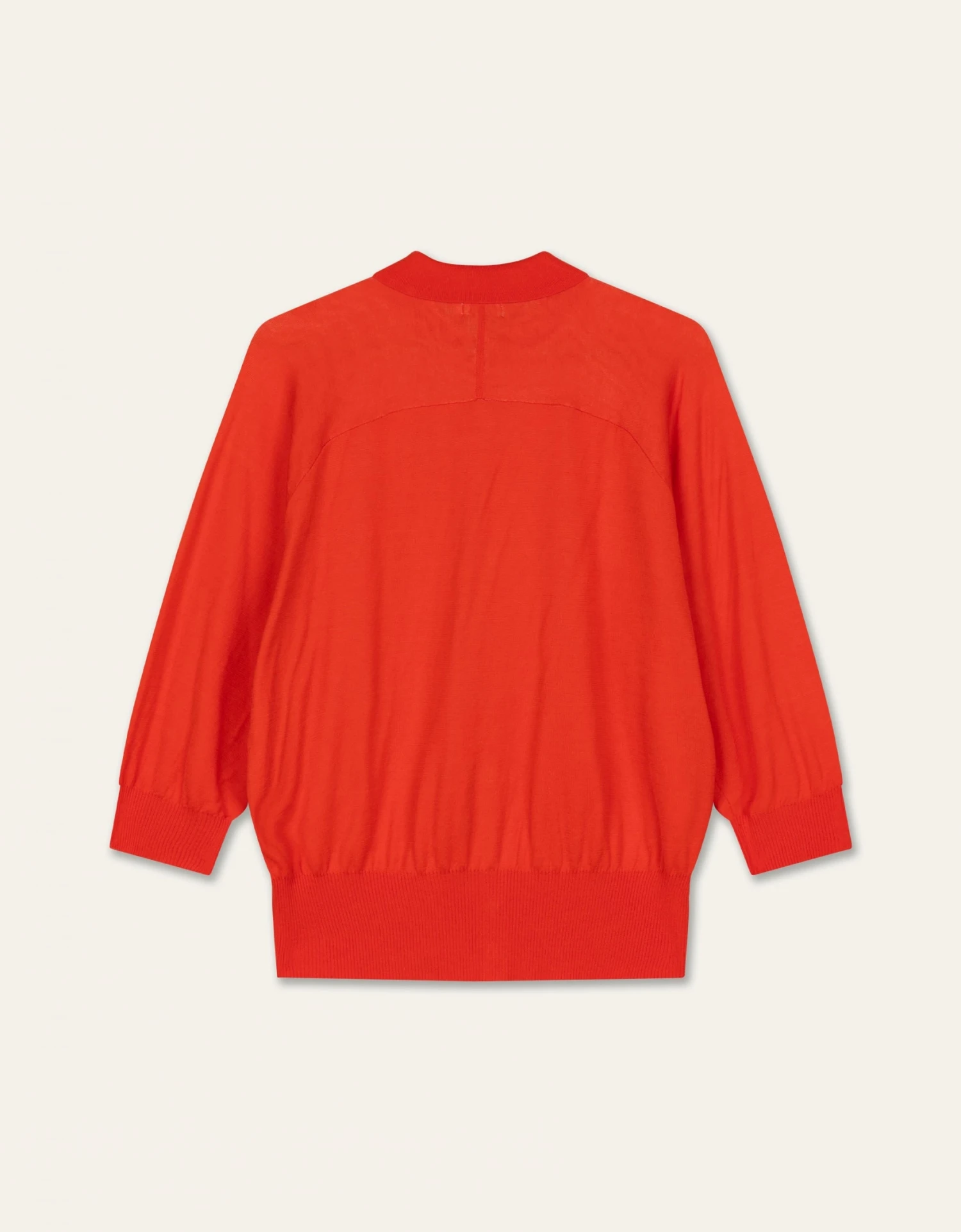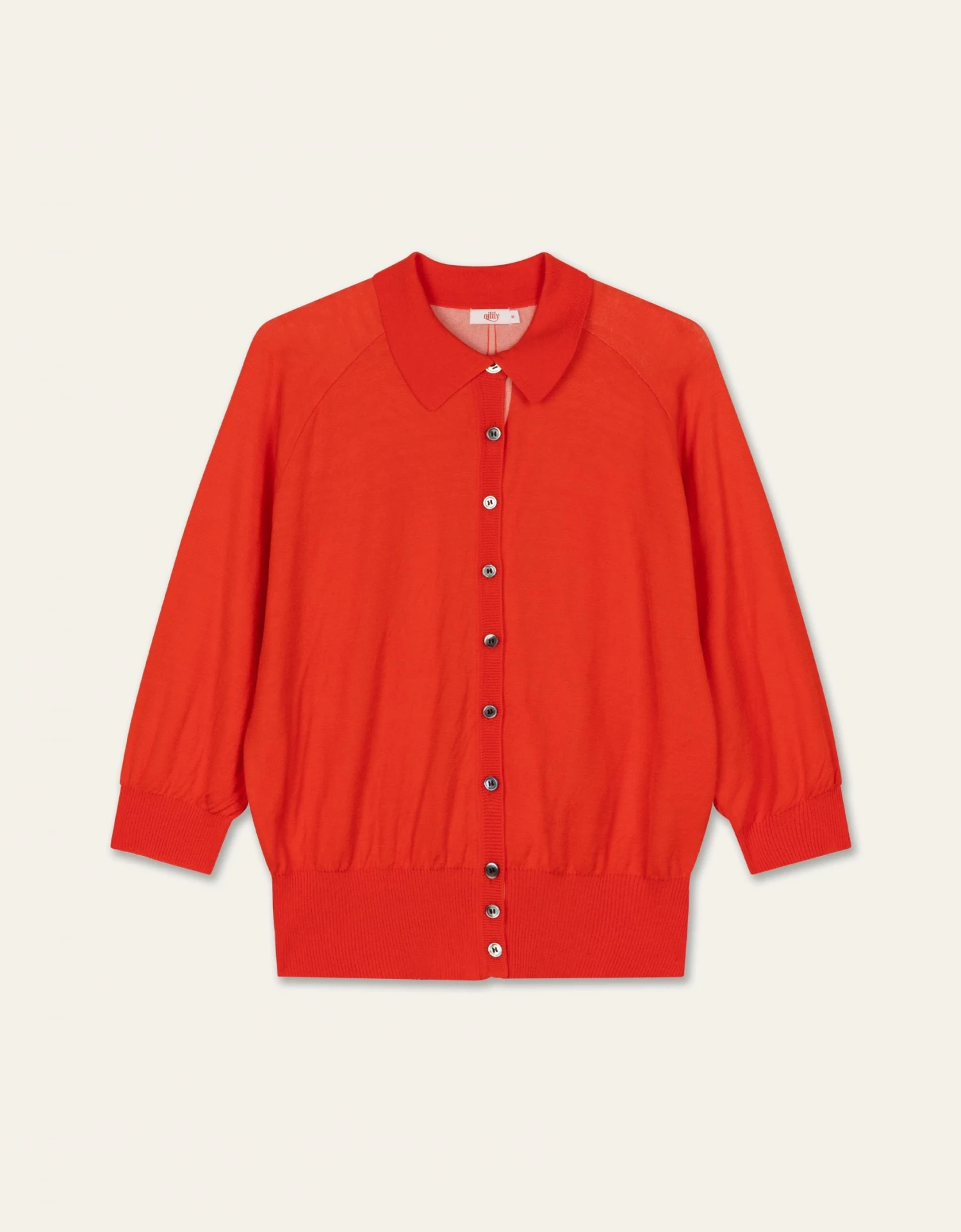 Dit kledingstuk verdient alle aandacht. Het is een double-layered knit; heel fijn gebreid en op speelse wijze met twee kleuren. Dit item is te dragen als vestje of als top, met bijna alle knoopjes dicht, op de bovenste paar na. Zo piept de contrastkleur er nog duidelijk doorheen. Hang het niet op, maar leg dit item op een plank in je kast om de vorm mooi te houden. – 100% Organisch GOTS katoen – Italiaans garen – 3/4 mouwen