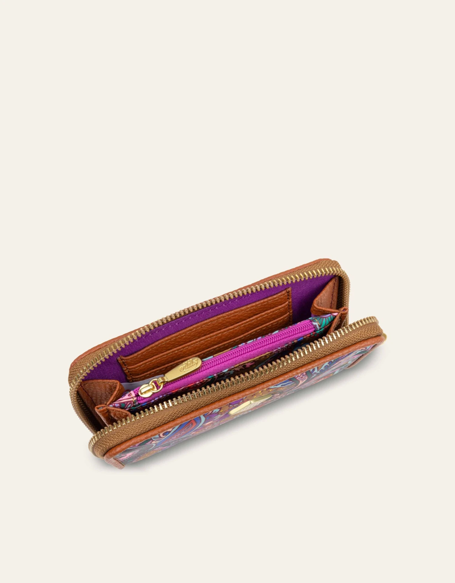 – Ronde ritssluiting geeft toegang tot 2 compartimenten, 1 ritsvak en 6 vakjes voor creditcards